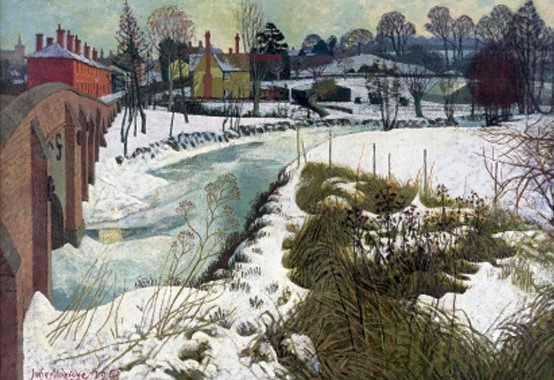 Alongside Slade School teaching duties and R.A. Council business, John continued to deliver a steady output of artistic works. His subjects were frequently local (Essex landscapes, Great Bardfield buildings or his garden at ‘The Place’) but they also included locations abroad – particularly Dejà in Mallorca, where his friend Robert Graves lived until his death in 1985. John produced relatively few portraits of people, but those whom he did paint were amongst the closest to him at the time: his first wife Lucie (pictured sitting with their cat in her lap) and Robert Graves, whose portrait now forms part of the National Portrait Gallery Collection. Other significant works are held by the Royal Academy, the Government Art Collection and the Fry Gallery in Saffron Walden, Essex – which is currently celebrating its 40th anniversary year. John Aldridge R.A. died at his home in Great Bardfield in 1983 and an obituary of Lambrook’s most honoured artist was published later in the Lambrook Chronicle.
