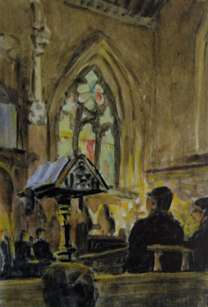 During his Senior School years at Uppingham, John continued to flourish – playing House Football, Cricket and Hockey as well as representing the School at Rugby and making brilliant speeches at debates. Having reached the Classical Sixth Form, his interests broadened and he became Company Quartermaster-Sergeant in the Officers’ Training Corps, Uppingham correspondent for the Lambrook Chronicle, Editor of the School Magazine, Captain of his House (The Hall) and Captain of Classics. Modestly, John omitted to mention in his Chronicle letters that he had also won the School Prizes for Latin Prose, Latin Hexameters, and Greek Jambics but he did report being awarded the Sketching Prize and his successor as Correspondent quipped that ‘Aldridge nearly ruined the School by his aptitude for gaining prizes!’ As at Lambrook, John had clearly made the most of opportunities at Uppingham and, having joined the Choir on his arrival, much later in life he produced a wonderfully evocative painting of the School Chapel.